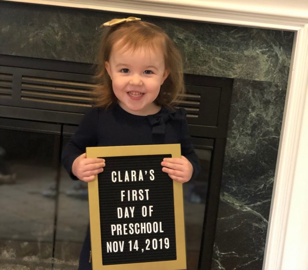 Well folks, she did it. As of today, we’ve got a full-blown preschooler on our hands! And like she does everything in life, she did it with a lot of passion and a little bit of sass. Last night, we packed Clara’s new space backpack, a gift that has been sitting dormant in the guest bedroom for weeks now. Extra clothes in case of accidents, winter gear for outdoor adventures, nut-free snacks for mid-morning sustenance. Then, we picked out her outfit, an adorable navy dress with gold accents- one of my recent favorite consignment shop finds! As I tucked her into bed, I asked her if she was excited to go to school, and with a grin taking over her face, she exclaimed, Yeah Mommy, I a big girl now!