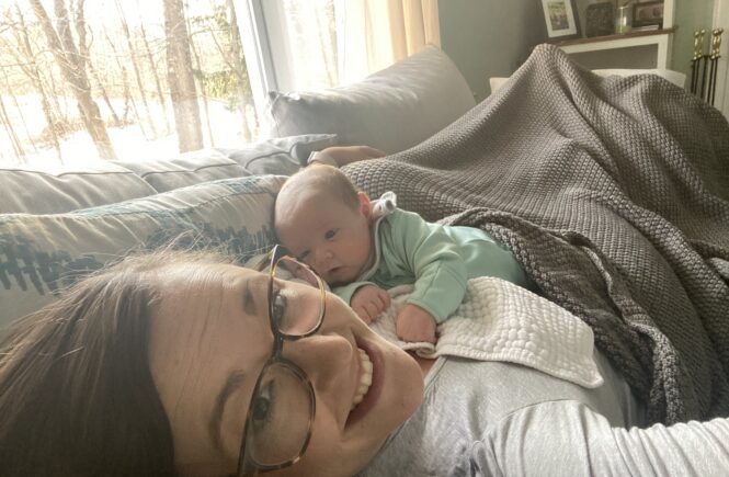 In his first days, with the omicron variant just starting to rage, I found myself isolated in the hospital.  My deepest sadness was rooted in the fact that the girls had to meet their brother over FaceTime.  Rather than letting that break me down, I accepted the reality and I made the best of it.  We sent Daddy to care for his sisters and  Harrison and I embarked on a little Mommy-Son vacation from the real world.  He snoozed and I watched Christmas movies and Friends on syndication.  He drank colostrum and I ate Italian subs.  We snuggled.  Honestly, it was two-and-a-half days filled mostly with joy.  But all good things must come to an end and we were elated when we finally got to go home. (So elated that I admit to crying when I picked Clara up at preschool.  Can we blame that one on the hormones?) And though our little man was also jaundiced, I knew the pressure to provide him with all the milk all the time didn’t have to just be on me.  He had two bottles of formula on his fifth day of life and one more on his sixth day.  And you know what?  He gained weight.  He didn’t need phototherapy.  And I didn’t lose myself.  Not yet, anyway.